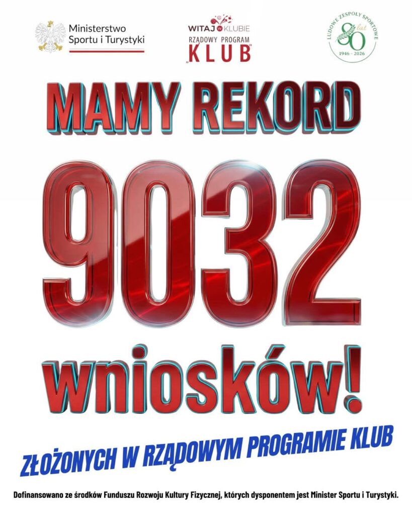 📊 9032 wnioski 🔥 To rekordowa liczba wniosków! – tyle wpłynęło w tegorocznym naborze. Ogromne zainteresowanie pokazuje, jak ważne jest wsparcie dla klubów sportowych w całej Polsce 🇵🇱